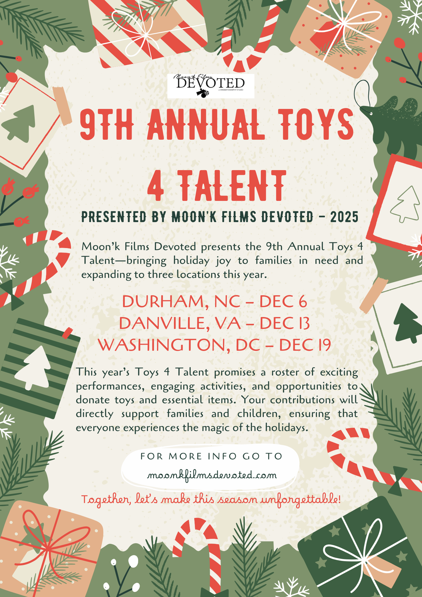 Join us for the 9th Annual Toys 4 Talent, presented by Moon’k Films Devoted, a heartwarming initiative dedicated to bringing joy to children and families in need during the holiday season. This year, we’re expanding our reach to three vibrant locations, making it easier for community members to participate and support this meaningful cause.